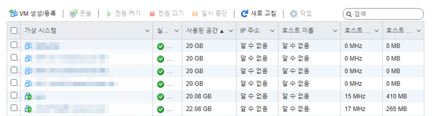ESXI 가상서버 리스트 화면에