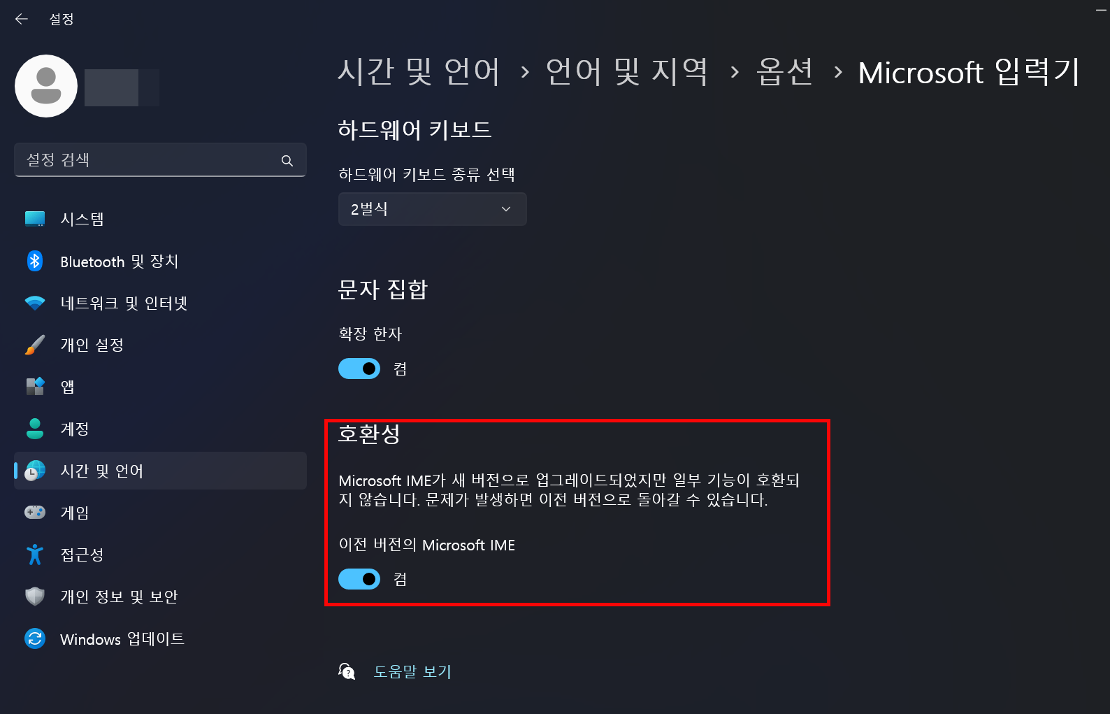 이전버젼의 Microsoft IME를 다시 켜주면 해결된다.