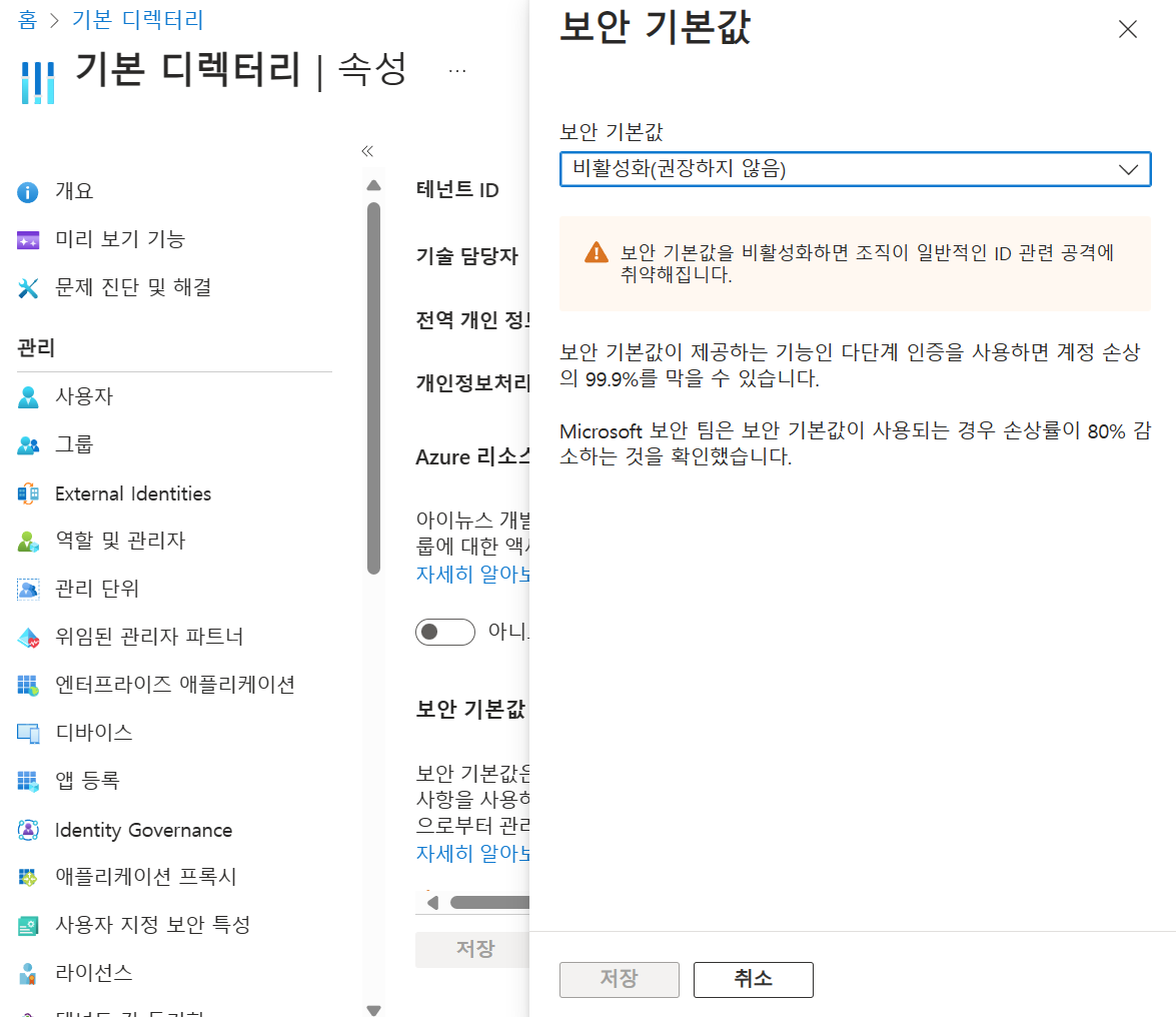 화면 맨 아래로 가서 "보안 기본값 관리"를 클릭한다.