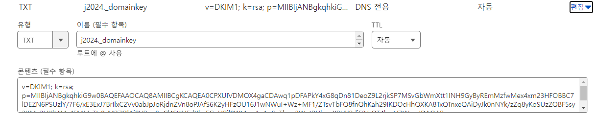 DNS 설정에서 TXT항목에 Suggested DNS Name과 키값을 붙여넣습니다.