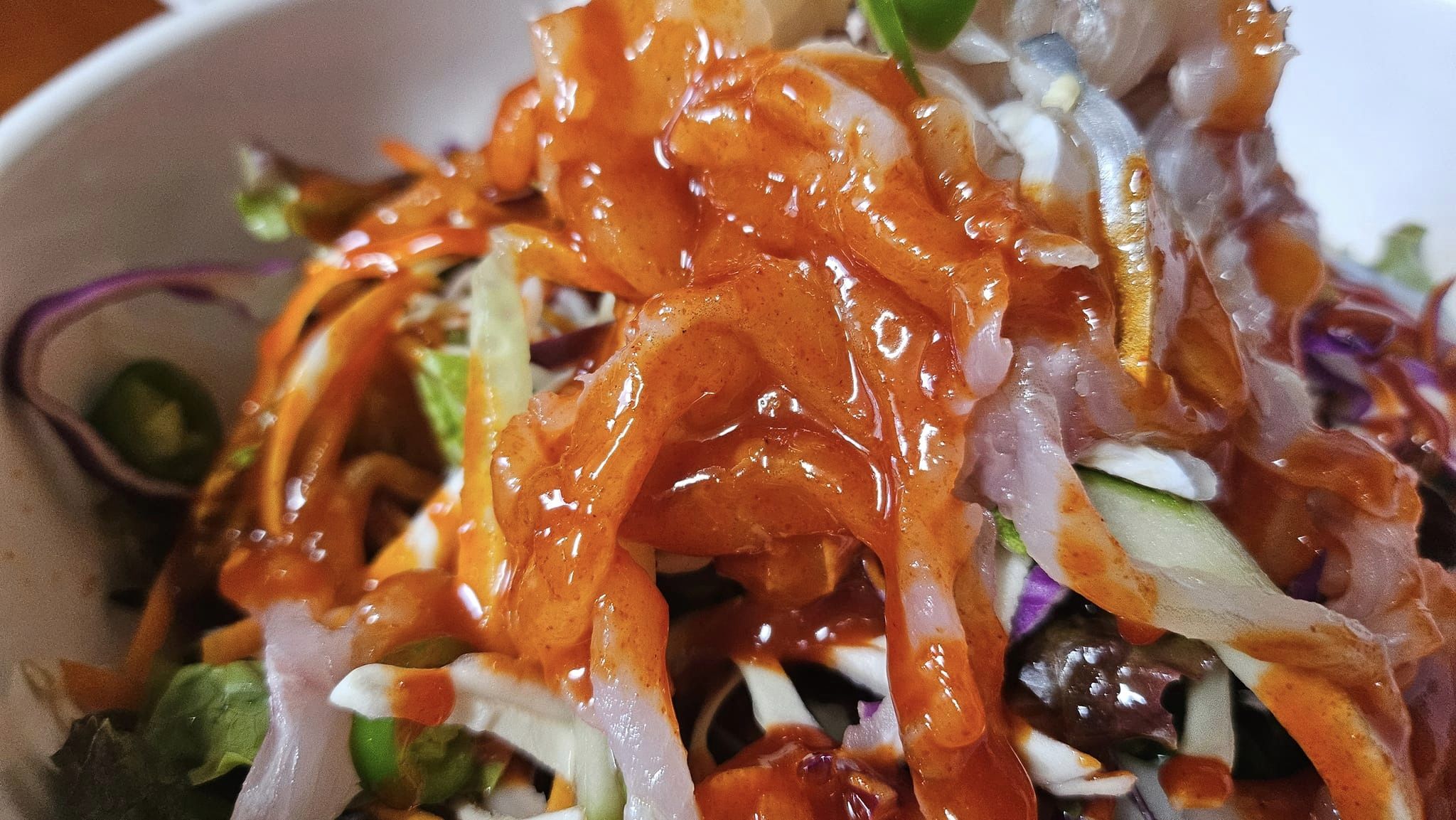 푸짐하게 나오는 해물에 특별한 소스를 비벼먹으면 바닷가에 있는거 같아요