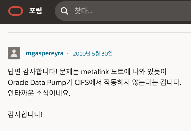 # mount.cifs //backup000/backup000 -o user=backup0000,password=비밀번호,uid=oracle,gid=oinstall /backup/